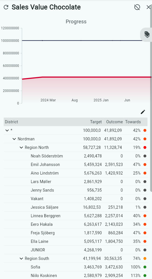 Forecast is always shown in this view, even if it was not selected during KPI creation. The purpose of the KPI Map is to provide a quick overview of how the entire sales team or region is performing by using colors.