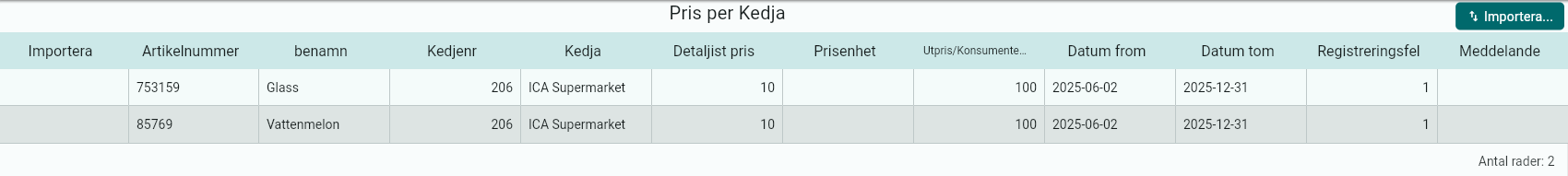 Using the Import Base Data function and the Price per Chain option, chain prices can be imported and linked to existing chains and products in the system.