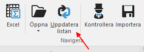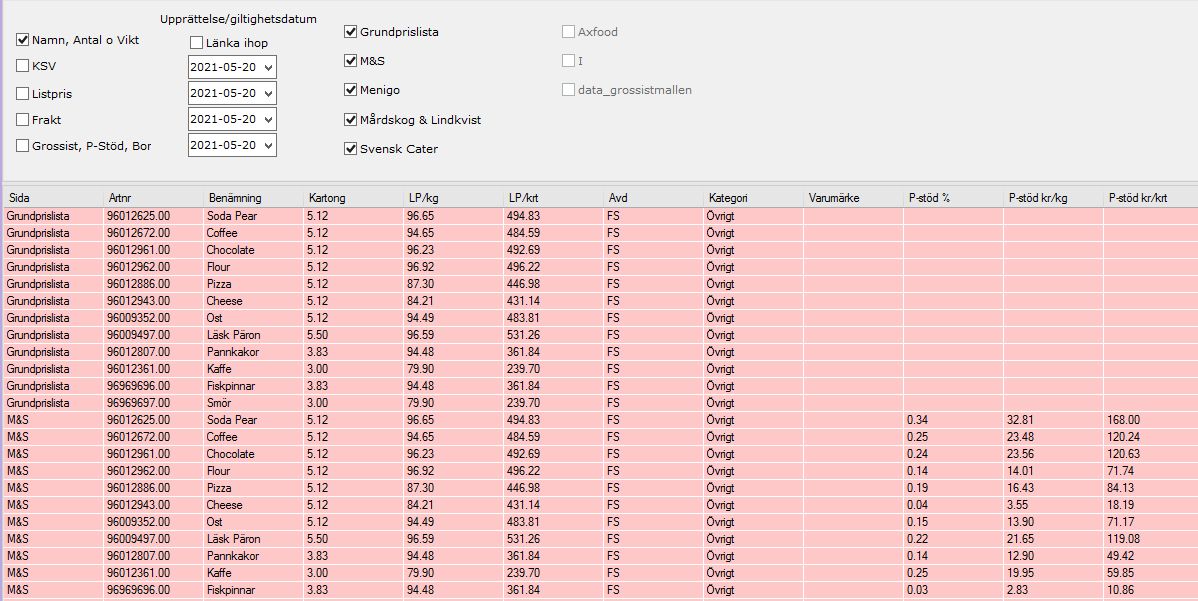 För att ”rätta” till gula raderna ska artiklarna läggas upp under Sortiment – Produkter. När artiklarna är inlagda gå till fliken grossistprislistor och klicka på knappen Uppdatera listan.