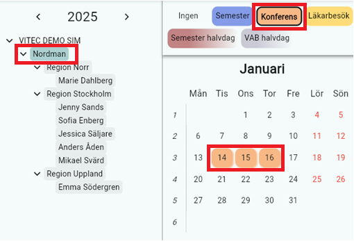 Vill du endast lägga till frånvaroorsak på en säljare; tryck på namnet i vänster spalt, klicka på orsaken, t.ex. Semester och märk dagarna det gäller genom att klicka på dem. Då sparas detta på endast den specifika personen.